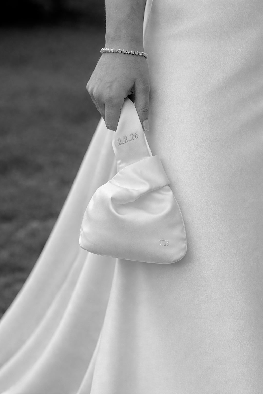 Together, we reimagined those remnants into a Bespoke Irvarna Orsi Keepsake Bag- crafted from the very satin she walked down the aisle in. The silhouette is softly sculpted in heirloom satin, with a twist knot handle that drapes effortlessly at her side. Inside, our signature woven bridal label is stitched as a quiet mark of origin- a reminder of the atelier where it was thoughtfully designed and made. Her wedding date, delicately embroidered along the handle and her initials subtly stitched at the base to honour the significance of the day. Not bold. Not loud. Just intentional.